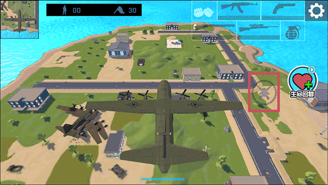 現(xiàn)在就跟隨飛機(jī)前往戰(zhàn)場吧,點(diǎn)擊右側(cè)紅色方框里的功能選項(xiàng)完成跳傘。