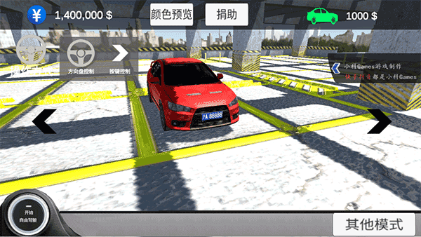 進(jìn)入游戲后,可在左上角設(shè)置【操作方式】,點擊車身顏色預(yù)覽區(qū)域可更換噴漆涂裝。完成基礎(chǔ)設(shè)定后,點擊左下方按鈕即可進(jìn)入【自由駕駛】模式開始體驗。