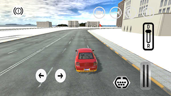 在【自由駕駛】界面,右上角按順序排列著喇叭、視角切換、重置以及暫停/菜單按鈕;第二排設(shè)有后視鏡開關(guān)和檔位控制功能;底部是虛擬方向盤、剎車與油門的操作區(qū)域,整體布局清晰明了,方便用戶快速上手操作。