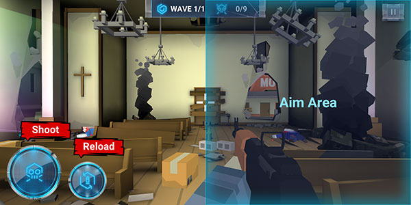 進入關(guān)卡后,在右側(cè)屏幕拖動即可移動準星,左側(cè)設有開火與換彈按鈕。