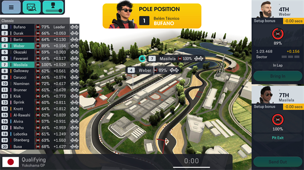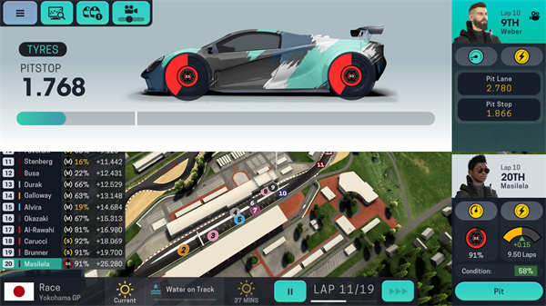 車手信息:屏幕左右下角會顯示你所屬車隊兩名車手的相關信息,涵蓋維修站、策略以及狀態調控方面的內容,具體包括名次、區段、距離對比、油量、輪胎磨損情況,還有駕駛模式對油耗和輪胎磨損產生的影響。