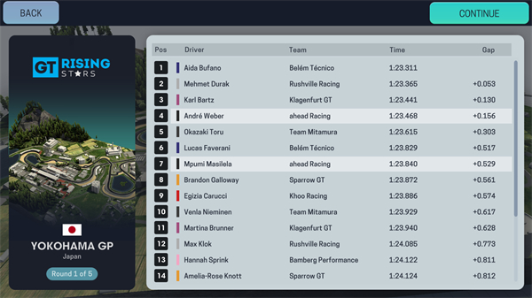 賽事界面的名次信息展示如下:屏幕左側區域呈現當前賽事的排名情況,同時還會顯示車手姓名、所屬車隊(通過顏色進行區分)以及輪胎的類型與磨損程度。