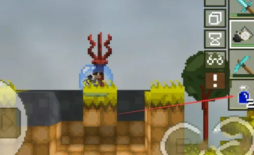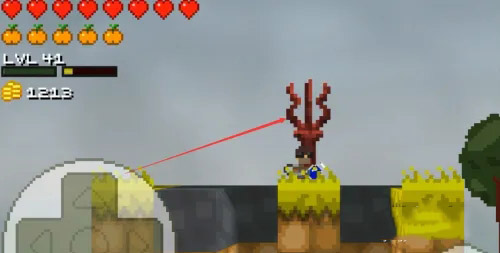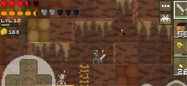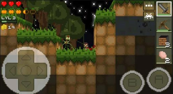 屏幕左下角設有控制移動的虛擬搖桿,可操控角色移動并向前探索;右下角的A鍵為跳躍鍵,連續點擊兩次即可觸發兩段跳,B鍵則是攻擊鍵。在冒險過程中,角色需要借助跳躍、潛水、挖掘等動作來保護自身安全。