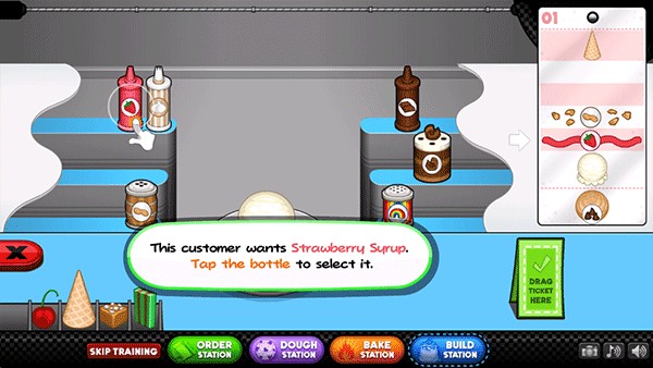 你得用手來舀冰淇淋哦!慢慢拖動(dòng)鏟子,盡量讓它的速度和籃筐周邊那些點(diǎn)的速度保持一致,這位顧客想要的是草莓糖漿,點(diǎn)擊瓶子就能完成選擇啦。