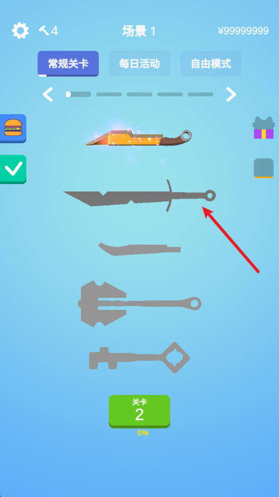 進入游戲后,我們得先挑選關卡來開啟挑戰,同時還能看到刀的大致輪廓。