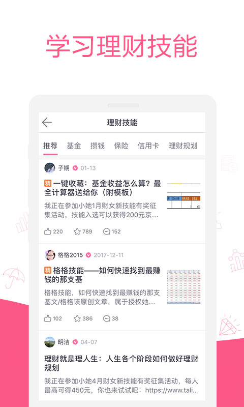 她理財的財女學堂每日都會為用戶實時推送各類通俗易懂的理財視頻課程,即便你是理財新手,也能輕松掌握理財技能。平臺上還匯聚了眾多理財達人,隨時與你分享交流各類理財經驗。更重要的是,這里有豐富的理財秘籍和基金攻略供你查閱,助你輕松成為理財達人。想要理財的朋友們還在猶豫什么?快和姐妹們一起開啟理財、攢錢、圓夢之旅吧!