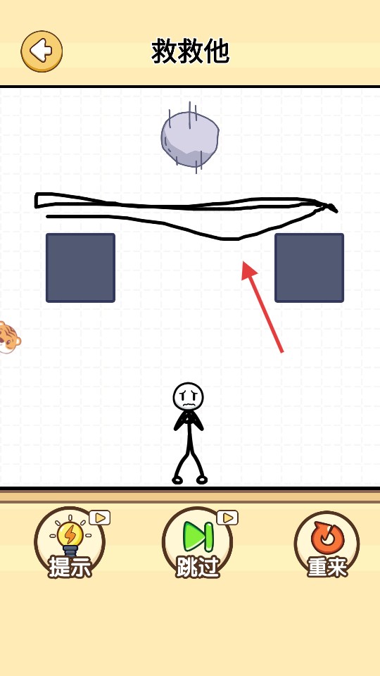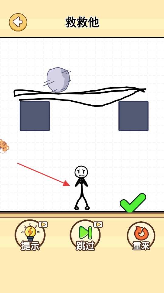 石頭落到線條上后,火柴人安全無恙,點擊右側的【√】,即可驗證方案成功并推進關卡。