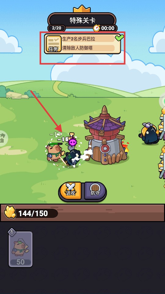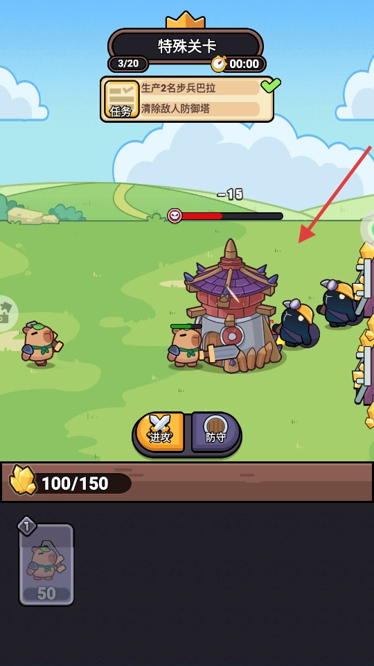 當你擁有充足的資源時,點擊【步兵巴拉】卡牌(會消耗50資源)進行召喚,以此來推進【生產2名步兵巴拉 - 清除敵人防御塔】這一任務。