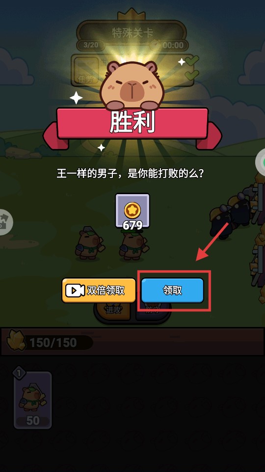 關卡獲勝后,點擊【領取】按鈕可獲得679金幣獎勵,若想提高收益,也能通過觀看廣告選擇【雙倍領取】。