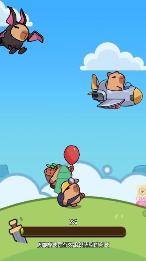 這個游戲圍繞卡皮巴拉展開主題。起初,你會進入一個布局復雜的戰場,投身于塔防戰斗之中。你得搭建合適的防御工事來守護自己的家園,并且要擊退所有前來入侵的怪物,以此完成相應任務。