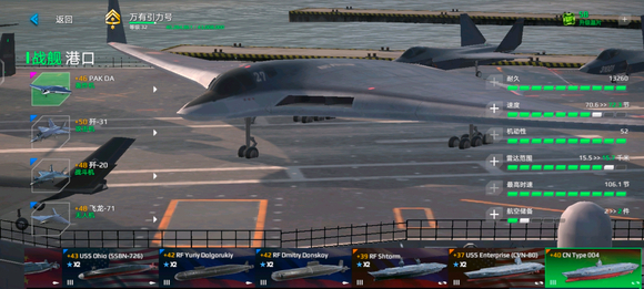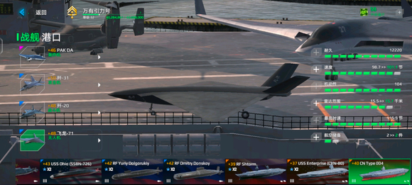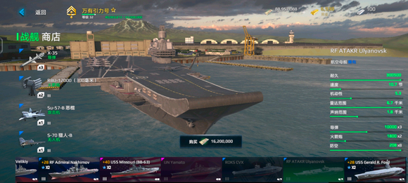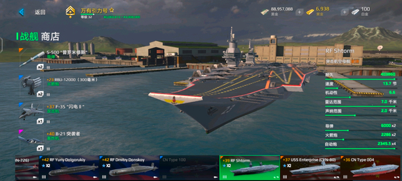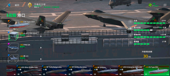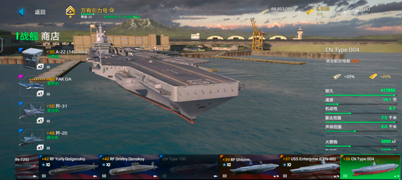 然后到了25級的突擊航母,這里有兩艘用美金購買的突擊航母,分別是風(fēng)暴和企業(yè)。如果是對戰(zhàn)真人玩家,個(gè)人更推薦選擇風(fēng)暴;要是打人機(jī)模式,企業(yè)的輸出會相對高一些。不過在擁有004之后,企業(yè)基本就派不上用場了(因?yàn)?04差不多就是加強(qiáng)版的企業(yè))。另外,風(fēng)暴的性價(jià)比也更高(風(fēng)暴售價(jià)8000萬美金,企業(yè)則是1.2億美金)。