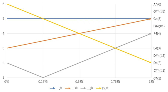 首先,我們需要熟悉五度標記法,其中陰平對應第一聲,陽平對應第二聲,上聲對應第三聲,去聲對應第四聲。這里的五度是相對概念,不存在固定的音調,五度之間也沒有絕對明確的音程。不過在ACE中,若要對念白進行調整,五度之間的音程間隔建議設定為一個全音,同時第四聲最好在原有基礎上向上移動兩個半音。