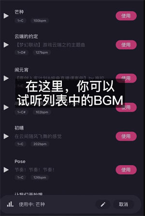 在這個頁面,你可以自由挑選心儀的BGM,選中后點擊“使用”按鈕就能完成更換。