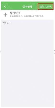 第二步:選擇“證書管理”選項,此時會看到界面右上角有“獲取兌換碼”的按鈕,點擊該按鈕即可進入自助購買證書兌換碼的頁面。