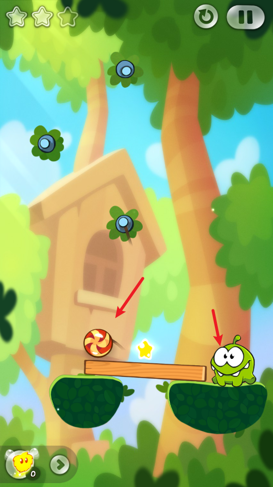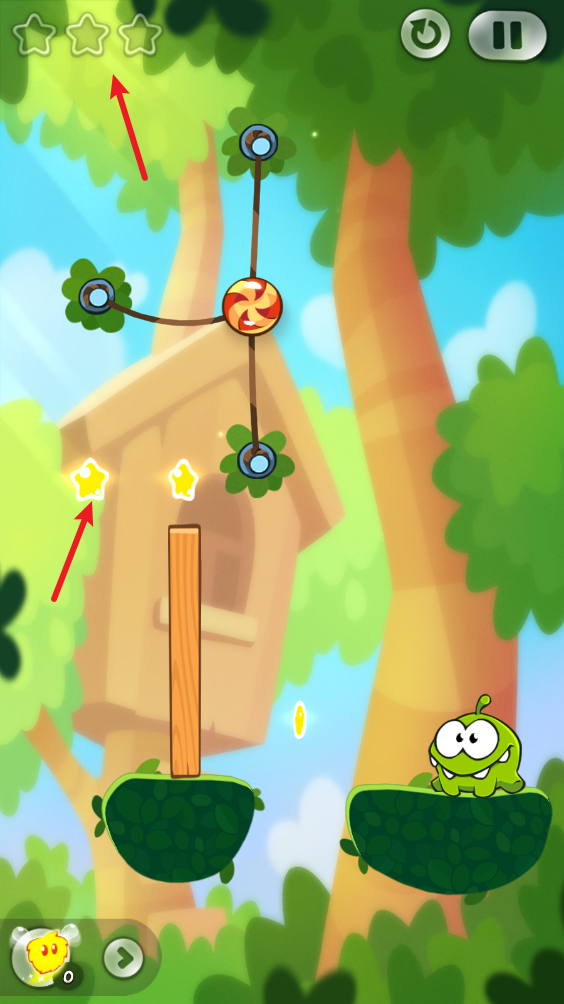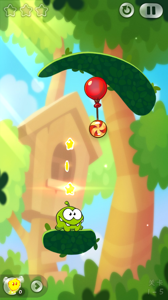 最后找準(zhǔn)時(shí)機(jī)割斷最后一根繩子,讓糖果順著木板滾落,收集星星后掉入小怪物口中。