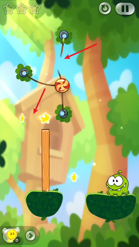 以這一關(guān)為例,我們先把最上方的繩子割斷,這樣糖果就會(huì)往左移動(dòng),撞到兩顆星星。