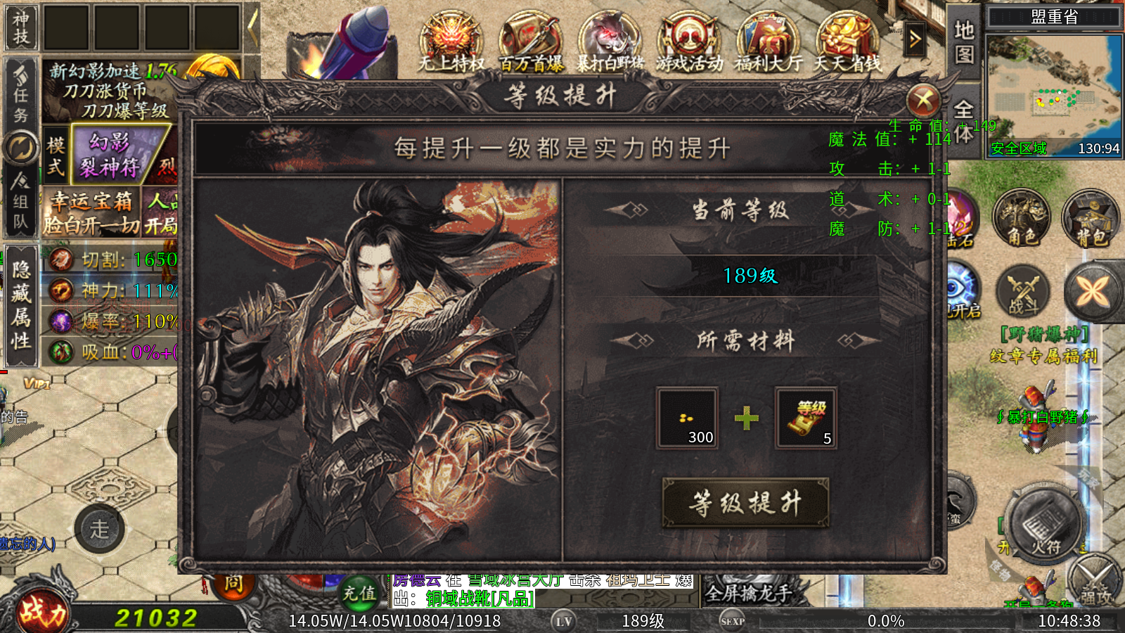 等級提升:人物等級到達188級之后,需要前往NPC處消耗金幣和等級卷軸進行提升,每升一級都會提供屬性提升。
