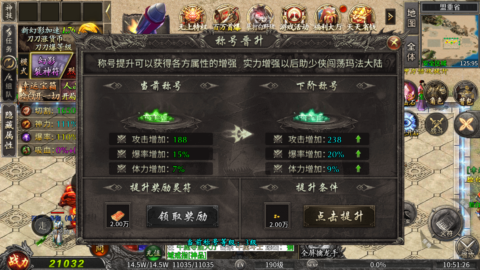 稱號晉升系統中,消耗金幣即可提升自身稱號等級。每次晉升不僅能帶來攻擊屬性加成,還能提高暴擊概率。此外,每次升級都有對應的禮包獎勵,開啟后可獲取大量靈符。