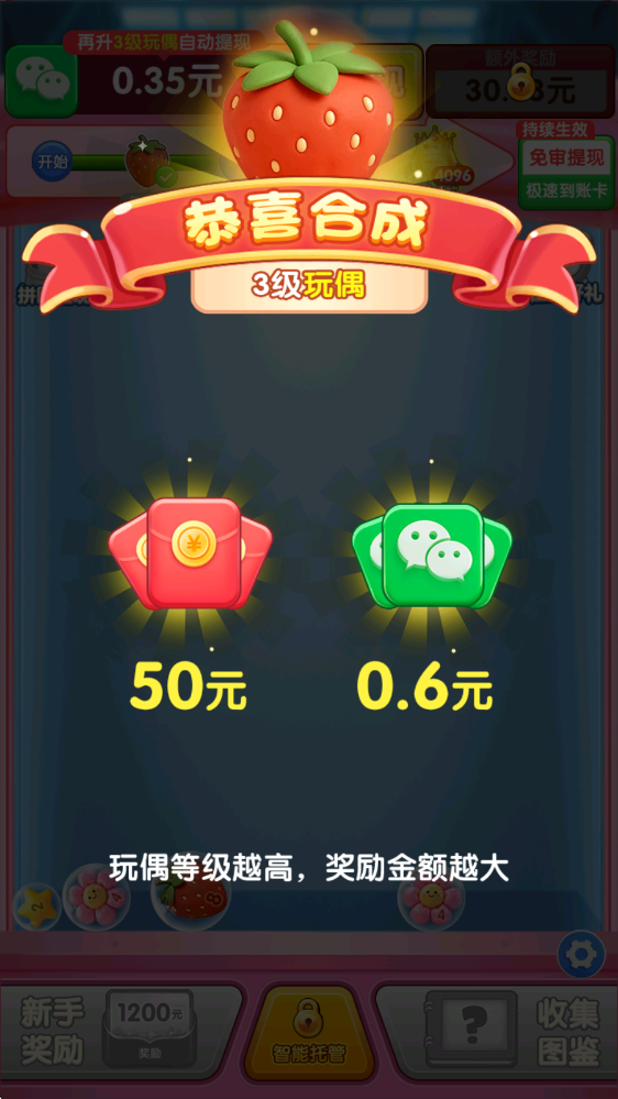 相同玩偶發生碰撞后,會自動合成為更高級別的物品;若此次合成是首次解鎖該物品,還能獲得額外獎勵。