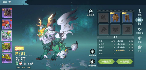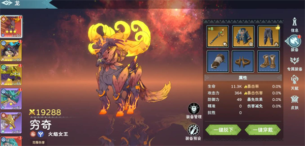龍的升級界面設有六個裝備欄,每只龍都配備這六個欄位,分別對應武器、頭盔、護腿、胸甲、圣物和專武。其中武器、頭盔、護腿、胸甲這四類裝備包含普通、罕見、稀有、神話、傳說、史詩六種品質;圣物可從時空幻境中獲取;專武需小龍進化至9星后自動解鎖,需要注意的是,并非所有龍都擁有專武,具體信息可在游戲內圖鑒中查詢。
