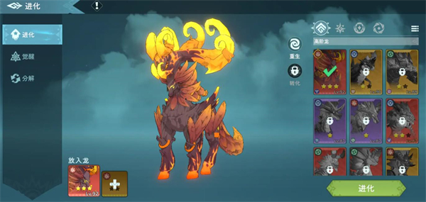 游戲里每條龍都存在潛能上限,一旦當前能力觸及這個上限,就得借助進化來提高它們的品質,這樣才能繼續升級。具體操作方式就是吞噬狗糧。在龍處于低星階段時,必須使用與待升級龍相同的素材作為狗糧;而當龍達到高星后,只需使用同屬性且同星級的任意素材作為狗糧即可。