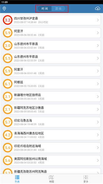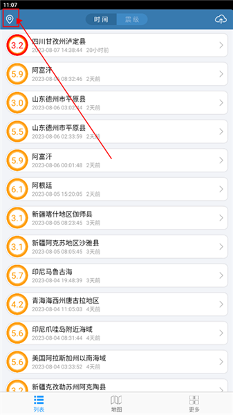 在“列表”頁面,找到你想查看信息的地區(qū),還能依據(jù)時間和震級進行查找。