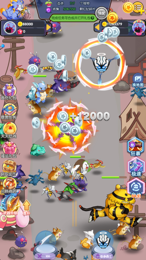 右側還設有極速、狂暴等功能可供開啟,能在短時間內提升你的戰斗力,助力你更暢快地消滅出現的敵人。