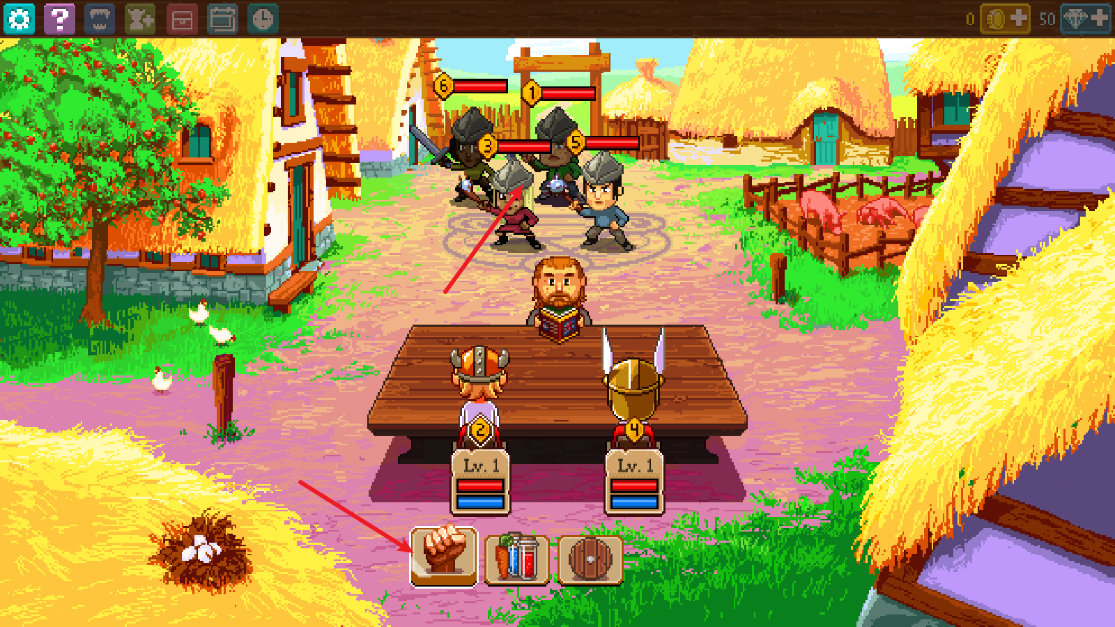 接下來會進行一段戰斗教學,我們先點擊攻擊鍵,再點擊對應的敵人就能發起攻擊。