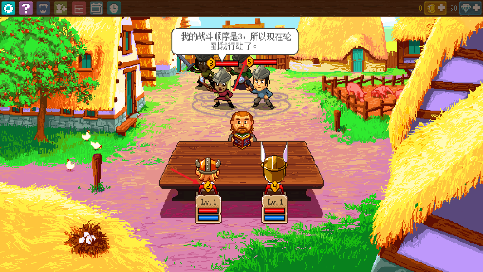 每個角色頭上的數字代表了行動順序。