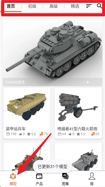 點擊下方的“模型”按鈕就能進入模型專區,在那里可以瀏覽裝甲車等各類積木戰車的搭建模型資源。
