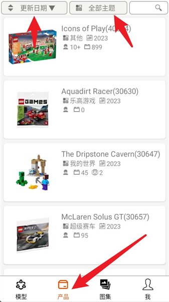 點擊下方的“產品”按鈕,就能查看所有樂高套裝,還可以按照更新時間和主題進行快速篩選瀏覽。