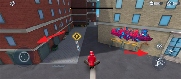 玩家可直接進(jìn)入游戲地圖,借助左側(cè)按鍵操控主角移動,右側(cè)按鍵則對應(yīng)蛛絲、攻擊等功能。