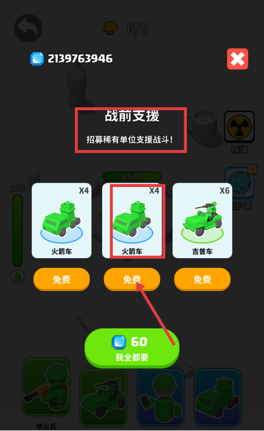 在【戰前支援】界面,可免費招募【火箭車】這類稀有單位,為戰斗補充強力戰力,提高獲勝概率。