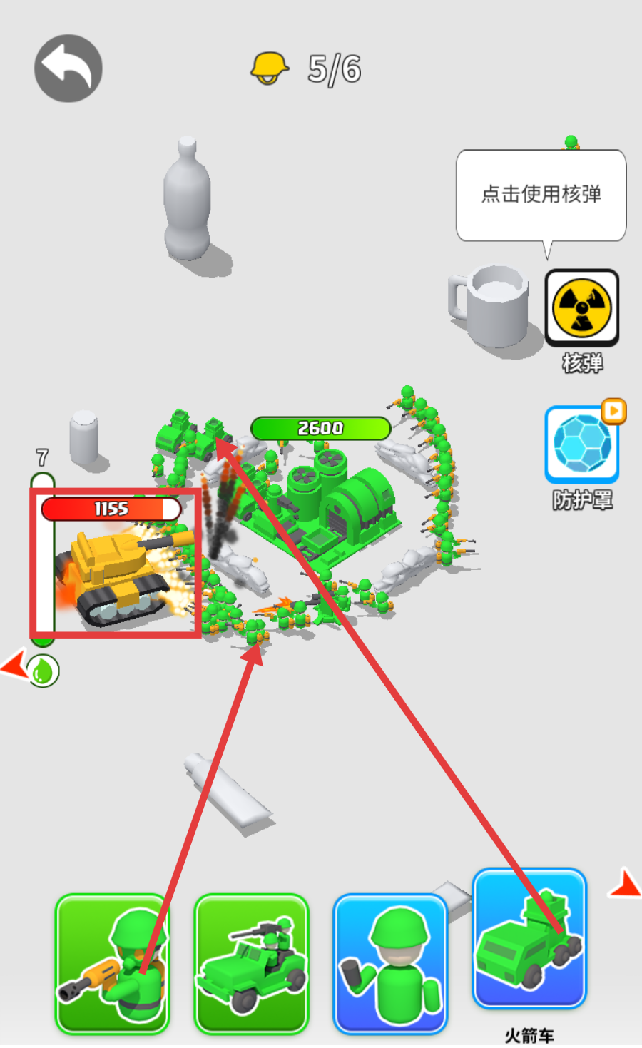 在戰斗中遭遇敵方【坦克-1155】時,可借助【火箭車】發起攻擊,與此同時要注意把握【核彈】和【防護罩】的使用時機。