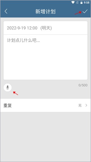 你可以通過手動輸入或語音輸入的方式寫下未來的計劃,然后根據自己的實際需求決定是否重復該計劃,最后點擊右上角的“√”按鈕,就能完成計劃的新增操作。