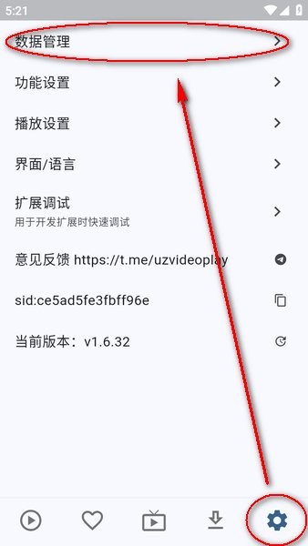 打開(kāi)uz影視后,找到右下角的設(shè)置選項(xiàng)并點(diǎn)擊,接著在設(shè)置頁(yè)面中選擇“數(shù)據(jù)管理”這一選項(xiàng)。