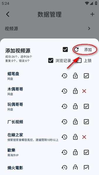 正在加載源,請(qǐng)耐心等待視頻源出現(xiàn)。待視頻源顯示后,勾選所有視頻源,然后點(diǎn)擊“添加”按鈕。