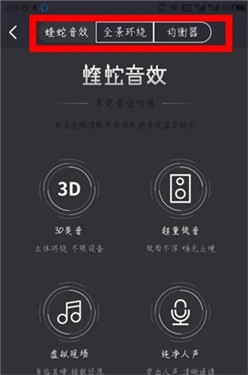 然后可以看到頂部的菜單選項,從中能選擇蝰蛇音效的全景環繞和均衡器功能。具體可參考圖示