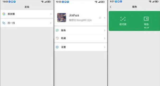 “發現”與“我的”這兩個界面,均僅設有兩個簡潔的功能入口;即便進入服務頁面后,也只有頂部的收付款和錢包這兩個選項。