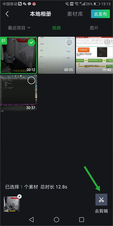勾選手機里的本地視頻,然后點擊右上角的“去發布”按鈕上傳視頻,上傳前還能對視頻進行剪輯。