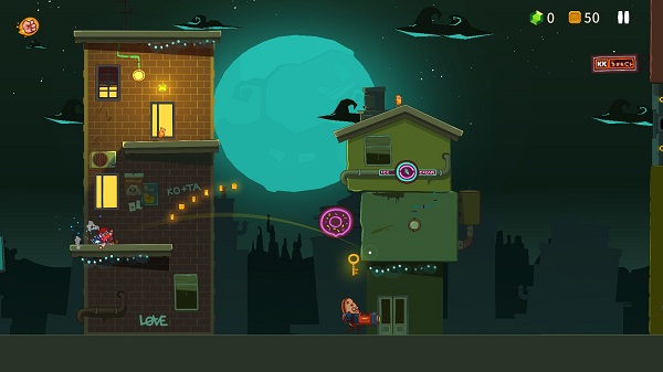 玩家基本只用一根手指就能操作,這里沒有上下左右的方向鍵,也沒有跳躍鍵。拖動(dòng)主角時(shí)會(huì)出現(xiàn)拋物線,隨后進(jìn)入“子彈時(shí)間”,周圍動(dòng)態(tài)會(huì)變得非常緩慢,松開手后,主角就會(huì)沿著拋物線軌跡彈射出去,并且能粘在任何地方。