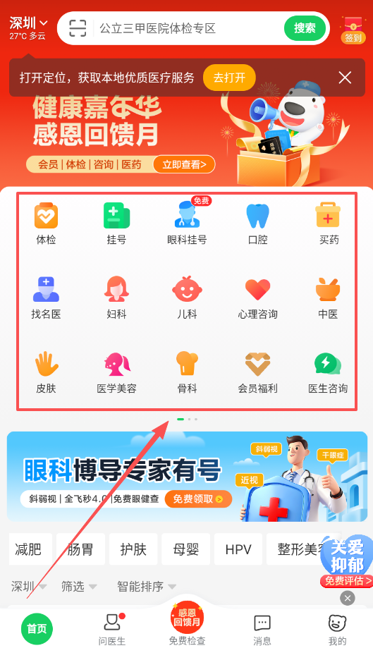進入主界面后,不用急著直接查找科室,建議先關(guān)注頂部的搜索欄以及“公立三甲體檢”這類專題活動入口,這樣能更快速地直達所需服務(wù)。