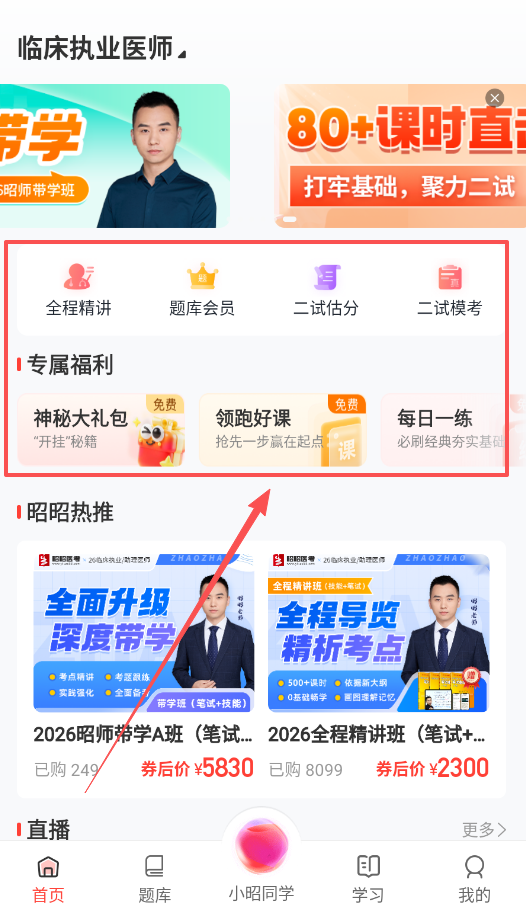 首頁是學習資源的匯聚之處,頂部導航欄能夠切換臨床執業醫師等各類課程,也可以參與免費活動來獲取學習資料。