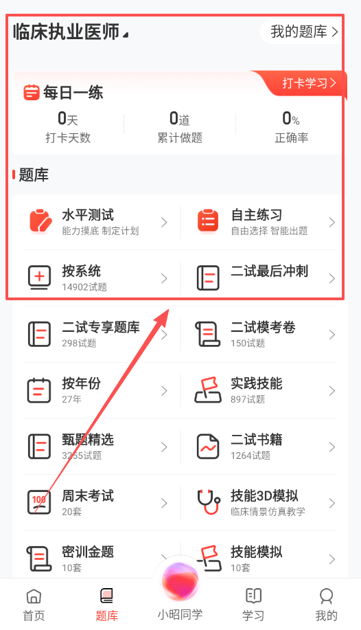 題庫頁面擁有豐富的題目資源,涵蓋每日一練、系統搜索功能,同時設有二試專享、按年份劃分、甄別精選等多種分類板塊。