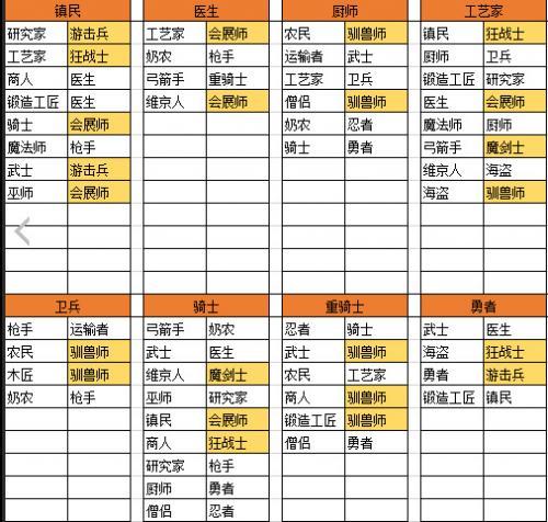 鎮民、醫生、廚師、工藝家、衛兵、騎士、重騎士、勇者父母職業搭配如下