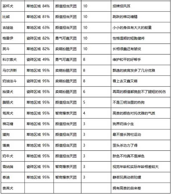 以下狗狗的召喚區(qū)域均按召喚概率最高的區(qū)域進(jìn)行列舉,表格中未呈現(xiàn)的狗狗,或許可通過放置禮盒挑戰(zhàn)等其他途徑獲取。