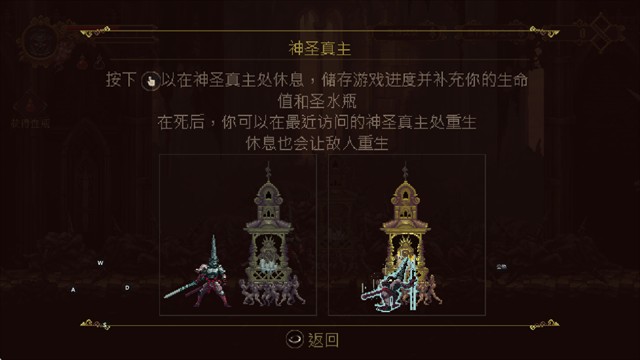 按下此處可在神圣真主處休憩,既能保存游戲進度,也能恢復生命值與圣水瓶。死后,你可在最近造訪的神圣真主處復活,不過休憩同樣會導致敵人重生。