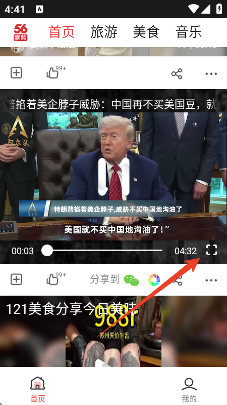 進入軟件首頁,選擇一個感興趣的視頻,點擊全屏播放