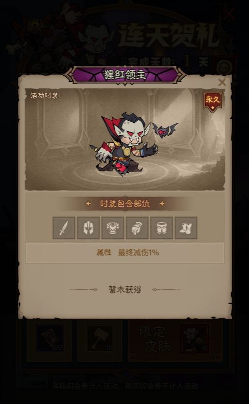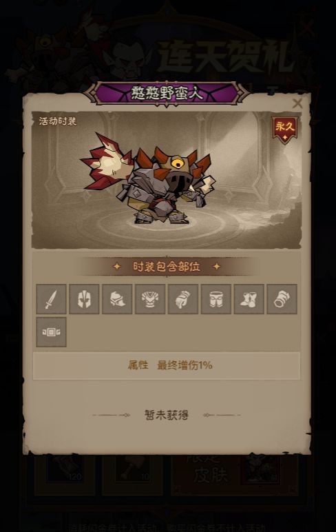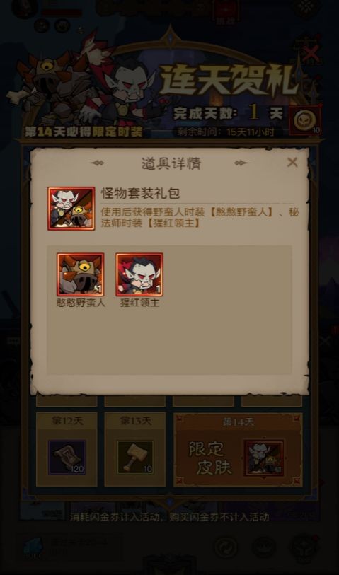 完成14天連續(xù)登錄的連天賀禮活動,就能領(lǐng)取限定時裝“怪物套裝禮包”,該禮包內(nèi)含憨憨野蠻人時裝與猩紅領(lǐng)主時裝。