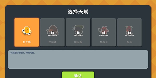 游戲設有五種初始天賦可供選擇,分別是打工鴨、生存者、搬運者、狂戰士和槍手;對于首次游玩的玩家,推薦選擇“打工鴨”作為入門選項,能幫助新手更快熟悉游戲玩法。